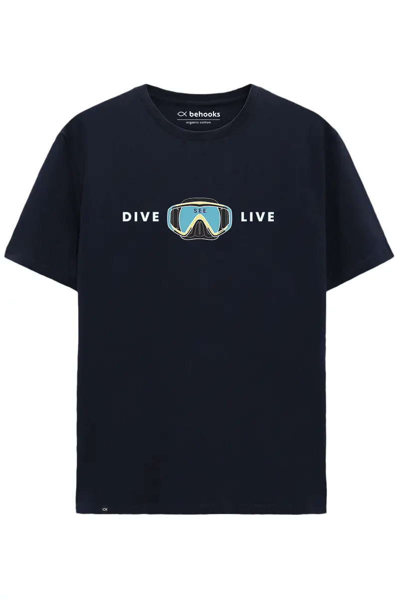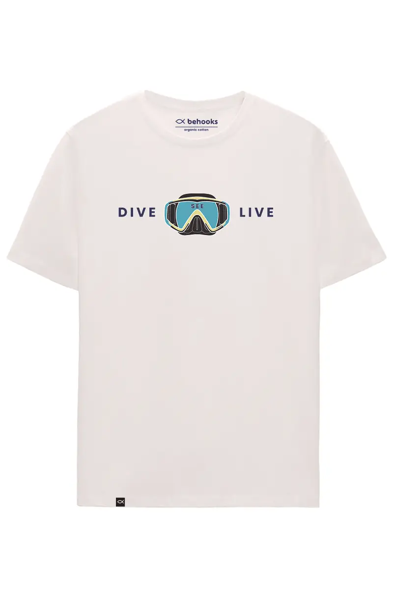 Camiseta Dive See Live. Sumérgete en lo esencial con este diseño de gafas de buceo y el lema “Dive. See. Live.” Ideal para quienes viven el mar intensamente. Camiseta unisex de corte regular fit (185gr), en algodón orgánico 100%. Disponible en azul marino y leche de coco y negro. Minimalista, directa y con alma submarina.