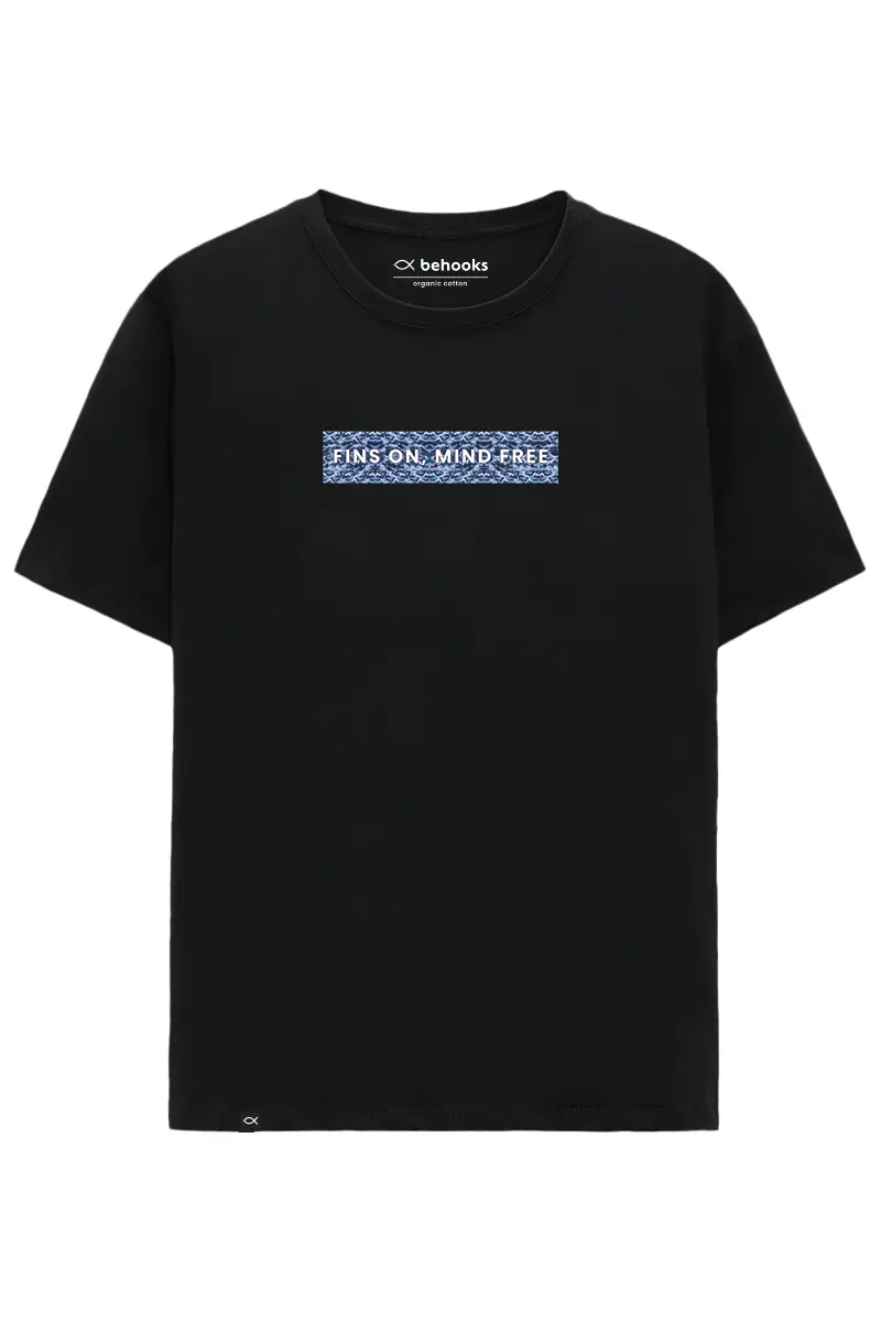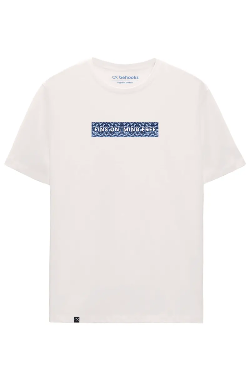 Camiseta Fins On Azul. Sube el volumen del mar y baja el del ruido mental con esta camiseta que lleva la frase “Fins on, mind off” en el pecho, dentro de una caja con fondo militar ocre. En la espalda, unas aletas de buceador también en militar ocre. Corte unisex regular fit 185gr en algodón orgánico 100%. Disponible en negro y leche de coco. Ideal para buceadores con estilo y calma interior.