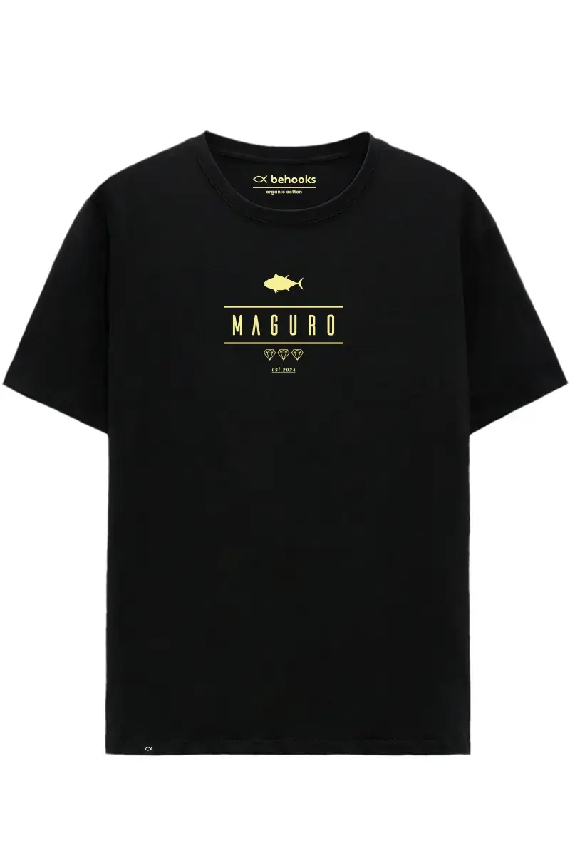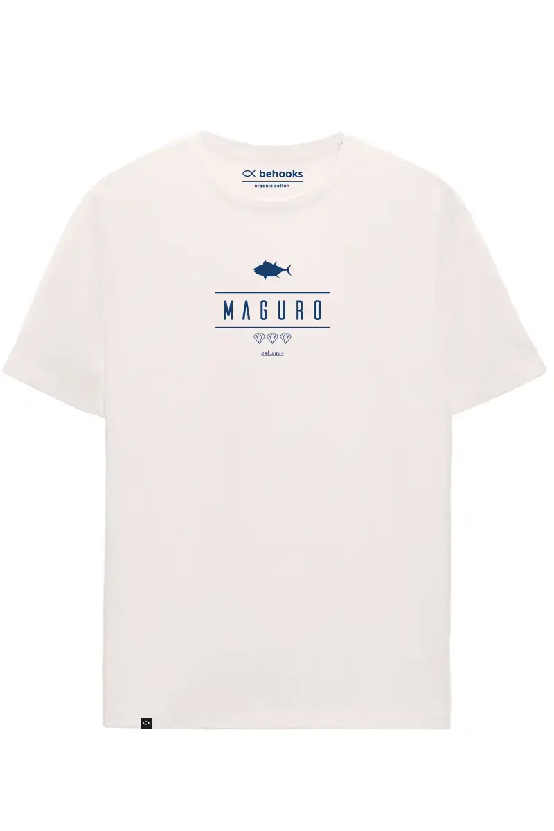 Maguro Diamond.  Camiseta de la colección Maguro, la primera colección dedicada al atún por Behooks. Maguro es como llaman al atún rojo en el país nipón (Japón). Para los japoneses, el atún es el diamante del mar. Es por ello por el cual diseñamos esta prenda con tres diamantes. Camiseta Algodón orgánico 100%. Disponible en negro y blanco roto.