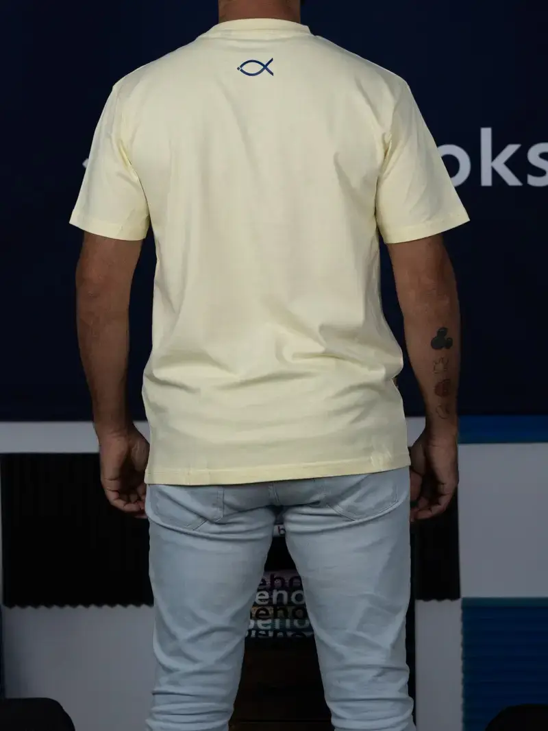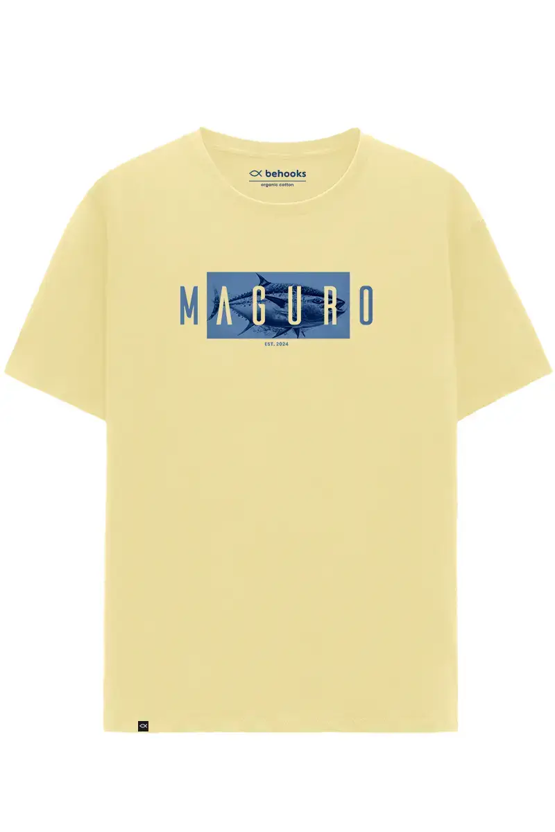 Uno de los modelos de camiseta de nuestra colección maguro es esta. Maguro es como llaman al atún rojo en el país nipón (Japón). De este modelo podrás encontrarlo en azul marítimo y amarillo crema. Camiseta de algodón orgánico 100%  con tallaje regular fit Unsex.
