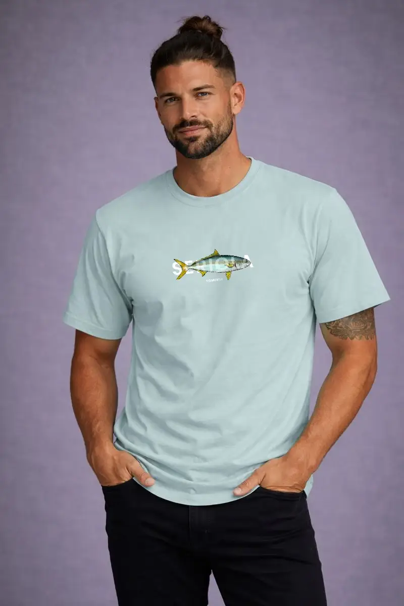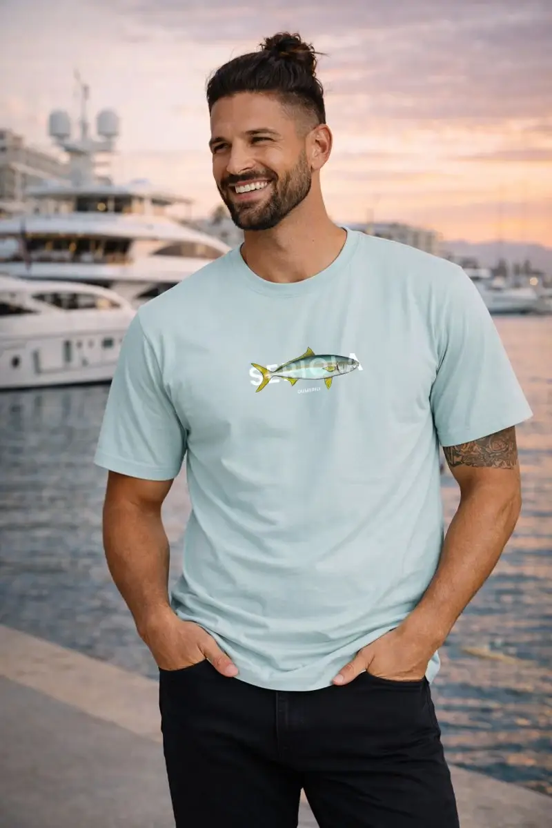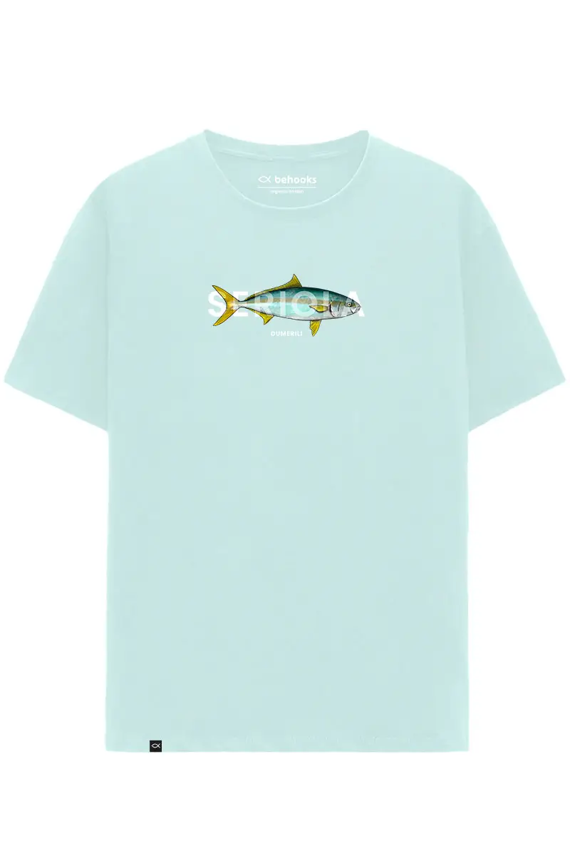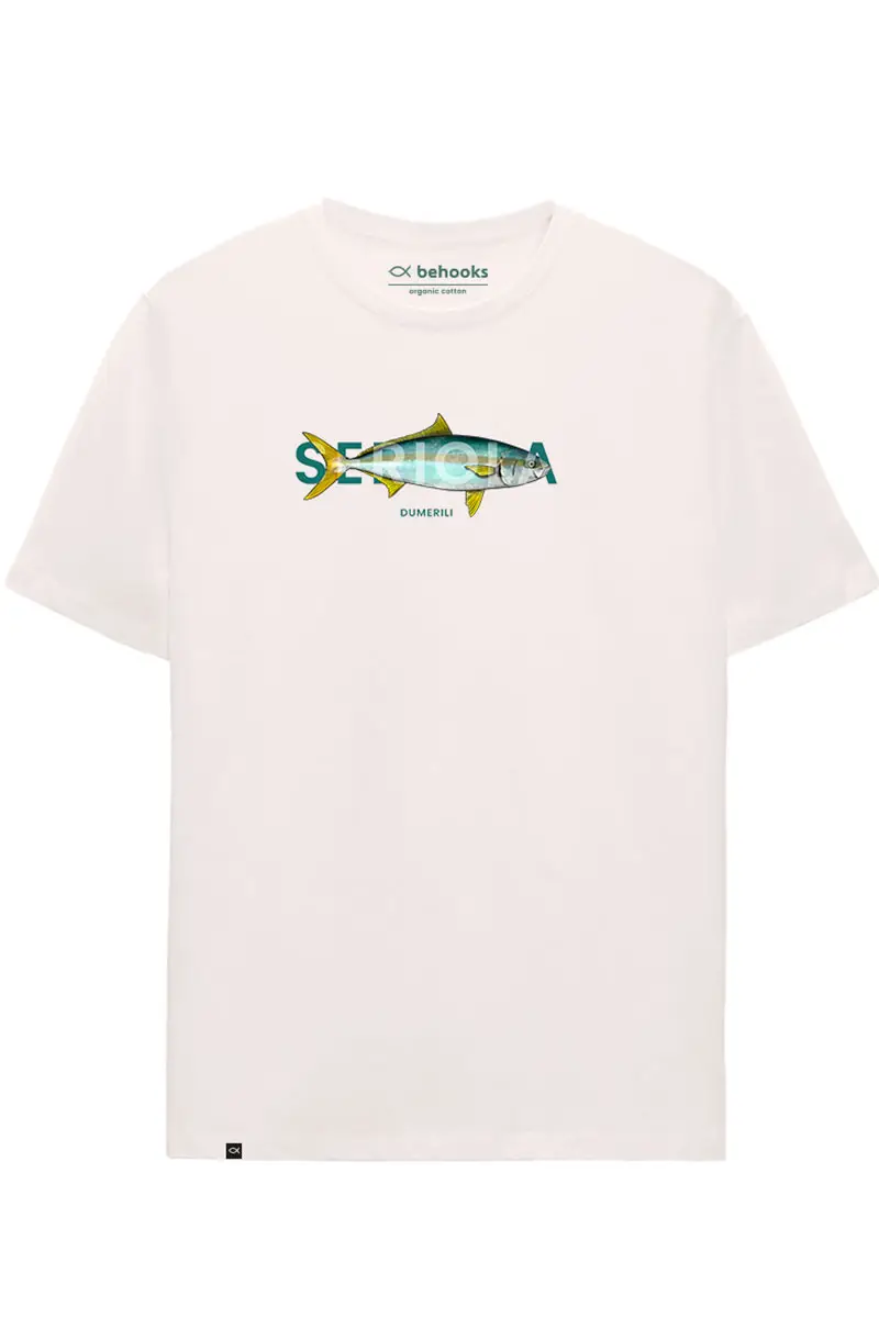Camiseta Serviola, Seriola Dumerili Realistic. Nuevo modelo de una especie enérgica en nuestras costa tanto para ver bajo el agua como para pescadores a Spinning tanto en el litoral Mediterráneo como en el Atlántico. Nuestra nueva camiseta de la Serviola o Pez Limón, va acompañada con su nombre biológico. Camiseta regular fit 185gr. unisex. Algodón orgánico 100%, podrás encontrarla en turquesa y Blanco roto. ¡No te quedes sin la tuya!