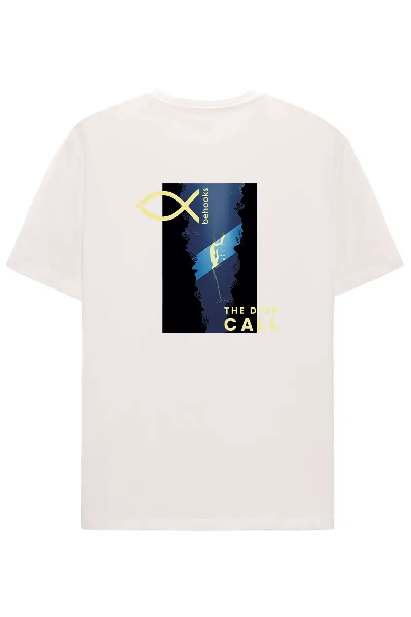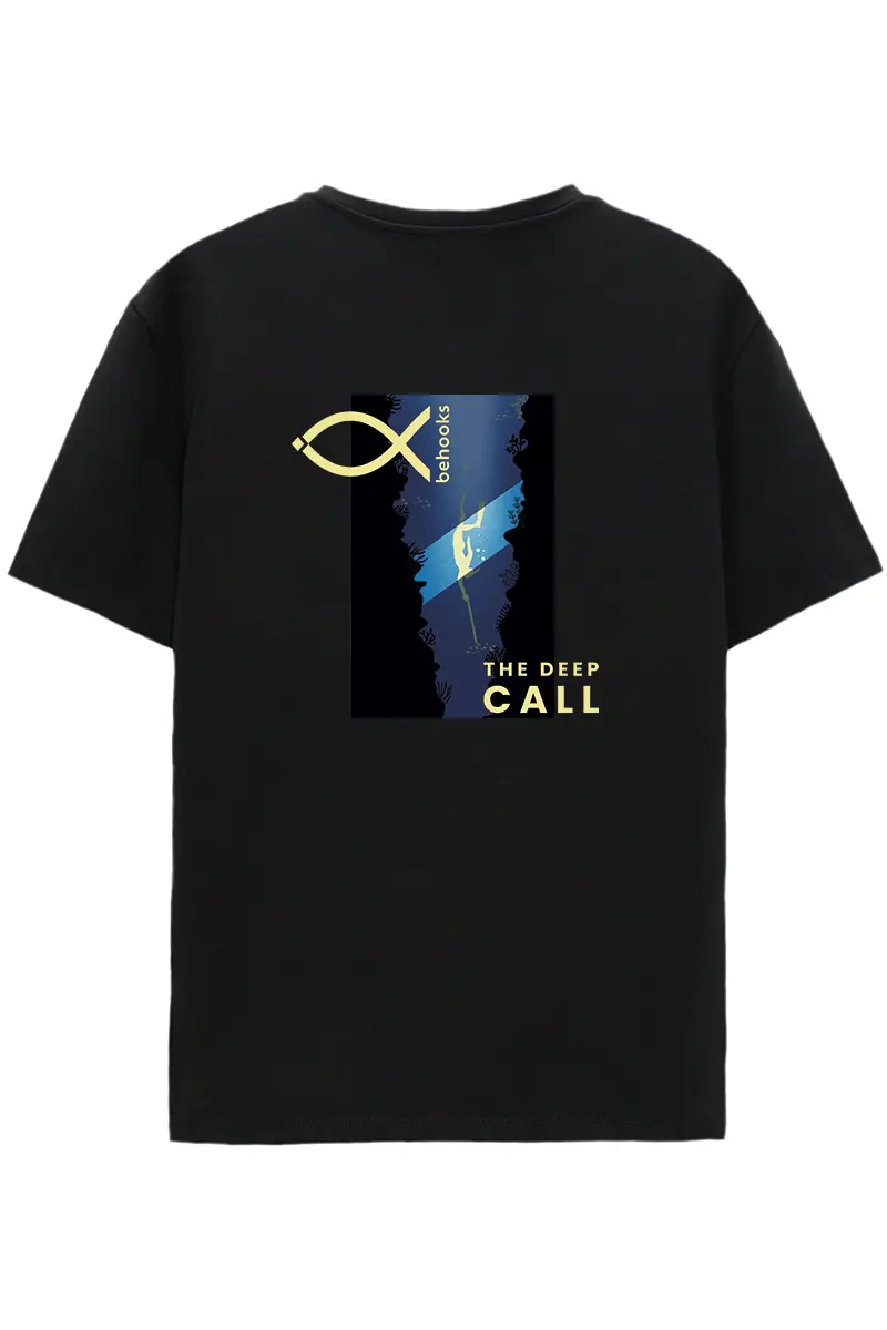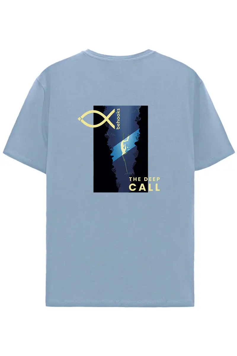 Camiseta The Deep Call. Diseño para los amantes de la pesca submarina: logo frontal discreto y en la espalda un submarinista con fusil descendiendo hacia las profundidades. Estilo sobrio, técnico y con carácter. Corte unisex regular fit de 185gr en algodón orgánico 100%. Disponible en negro, leche de coco y azul celeste. Ideal para los que viven el mar bajo la superficie.