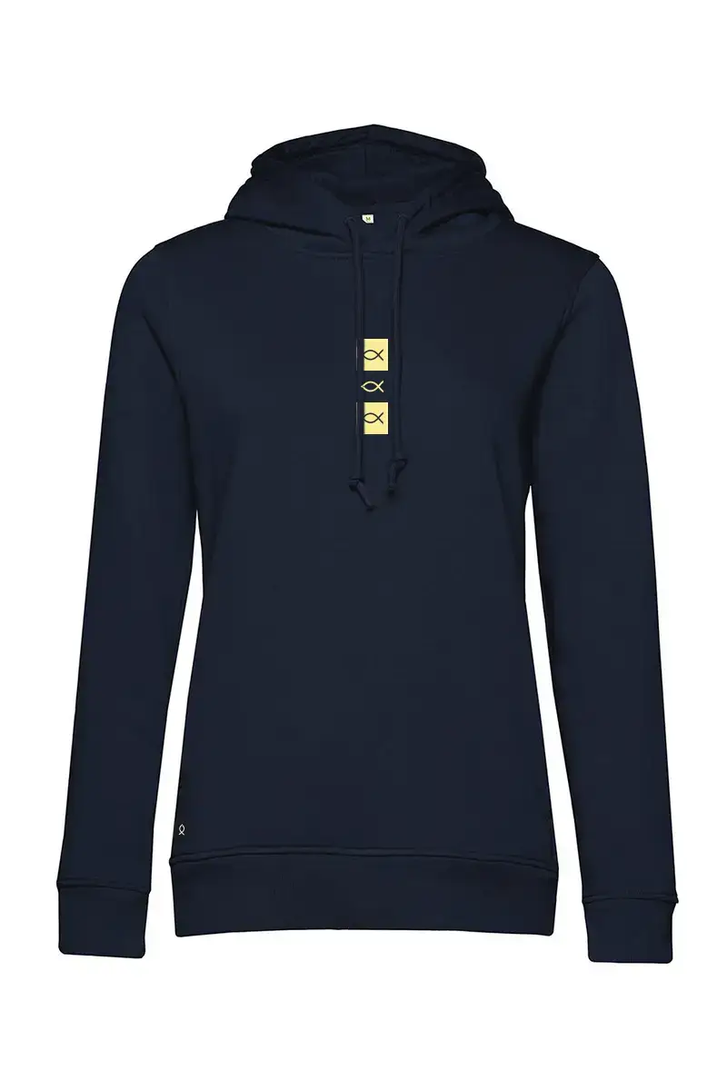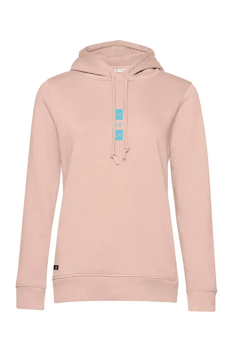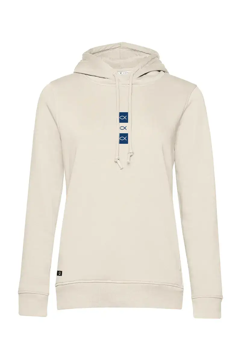 Sudadera con capucha o hoddie para mujer. Modelo three icons. Otro modelo de la marca utilizando un diseño minimalista del isologo de la marca en positivo y negativo. Sudaderas de Algodón 100% orgánico de 280gr. Es una hoodie finita, ideal para el entretiempo de ahora. Disponible en color blanco roto, rosa y azul marino. Prenda exclusiva para mujeres.